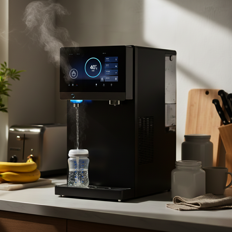 L'eau chaude très rapide, c'est la meilleure fonction. On a une eau parfaite pour le biberon et le thé du matin. C'est compact, ça ne prend pas trop de place sur le comptoir.